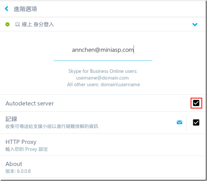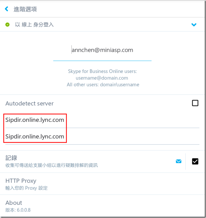 2.在Autodetect server輸入Sipdir.online.lync.com。
