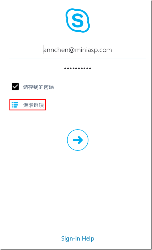 1.第一次登入Skype for Business的畫面,如果輸入帳號密碼卻出現錯誤不能登入的話,請點選進階選項。