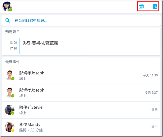 5.一進入後可以看到行事曆中的預定行程和最近即時通訊的紀錄。右上角有會議和連絡人的選項。