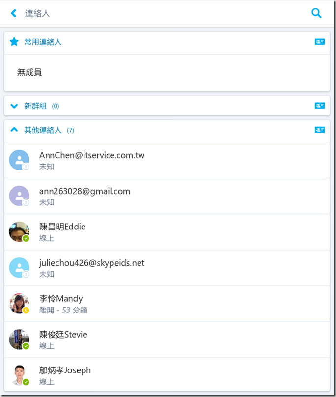 7.此為連絡人的畫面,基本上和桌面版Skype for Business完全一樣。