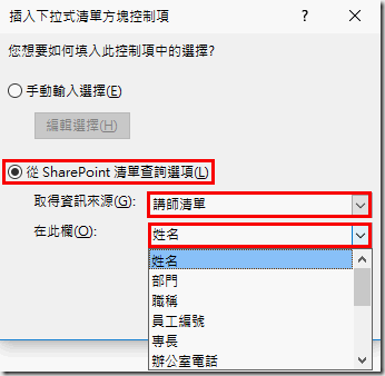 講師姓名的控制項是一個下拉式選單,且選項要從另一個清單中的欄位抓取。