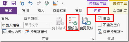 1.選取該控制項後,點選內容,勾選唯讀,使用者就不能更改其內容了,然後點選預設值。