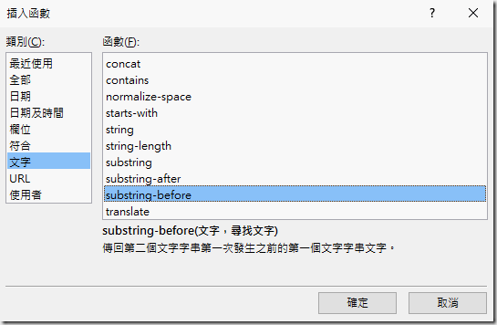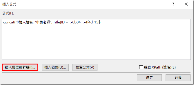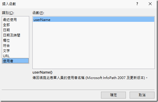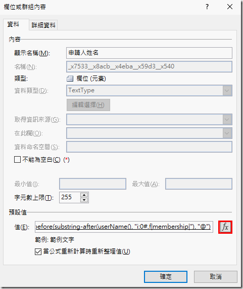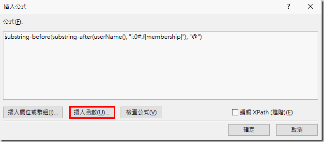 3.點選插入函數,設定預設值為substring-before(substring-after(userName(), "i:0#.f|membership|"), "@")。