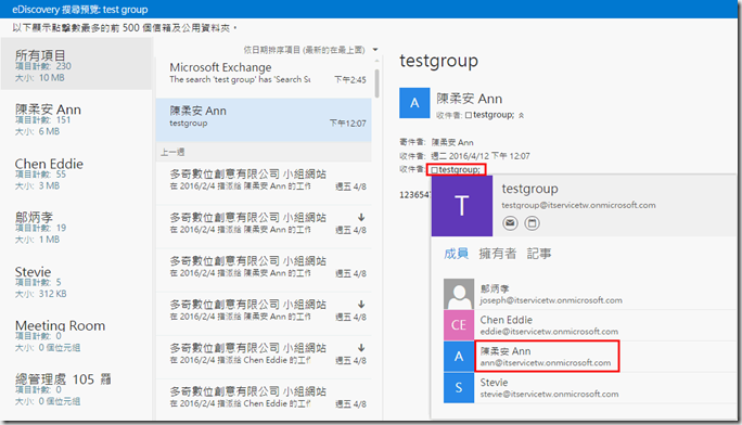Office365中有許多搜尋郵件的功能,讓我們能搜尋特定收件者或寄件者的信,但有時候信是寄給群組的,那假如使用者A在群組B中,搜尋收件者為A的信時,能夠搜尋到寄給群組B的信嗎!?