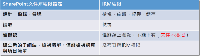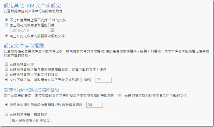 在Office 365 管理者日誌 (68) 啟動Office365的版權管理 設定自動加密信件中,提過了如何開啟Office365中的版權管理服務,並結合Exchange Online自動加密信件,同樣的RMS也可以結合SharePoint Online來保護裡面的檔案。SharePoint的文件庫或清單通常都已經設定好存取權了,但是檔案被下載下來後,SharePoint不就管不到了嗎?這時版權管理就派上用場了,SharePoint中的IRM,可以設定檔案被下載時自動加密,所以即使檔案離開了SharePoint,也還是保有SharePoint設定的存取權限。