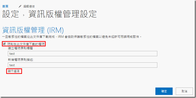 3.勾選限制在此文件庫下載的權限,設定標題與描述,點選顯示選項。