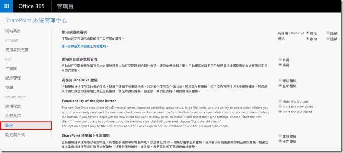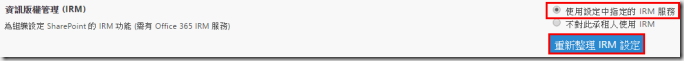 2.往下拉找到資訊版權管理,點選使用設定中指定的IRM服務,點選重新整理IRM設定,最後記得按儲存喔!