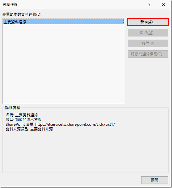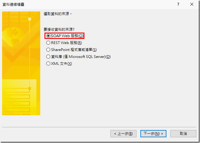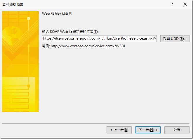 5.輸入https://組織名稱.sharepoint.com/_vti_bin/UserProfileService.asmx?WSDL