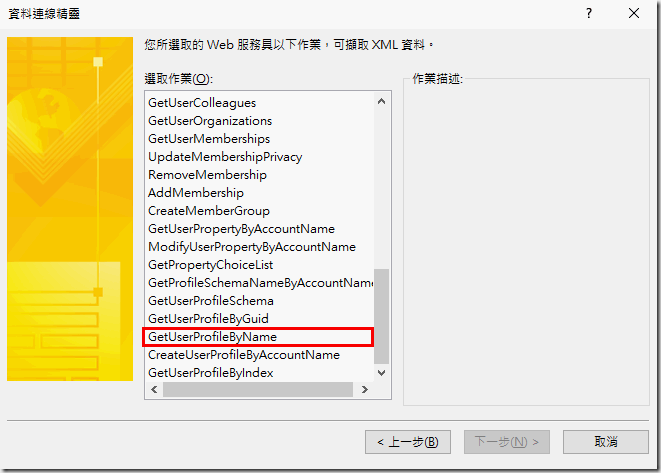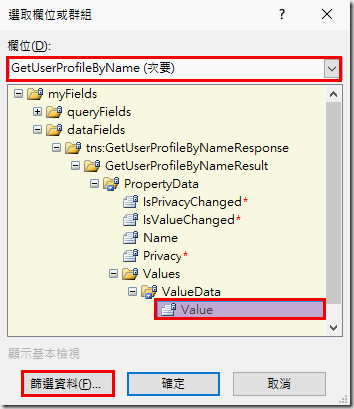 5.在欄位的下拉式選單中,選擇GetUserProfileByName(次要),點選圖中該位置的Value欄位後,然後點選篩選資料。