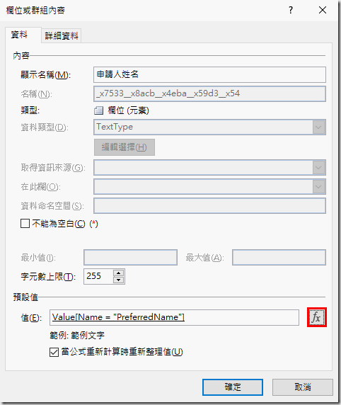 在InfoPath中,如果希望某一格不能由使用者亂填,要直接抓取當前使用者且不能更改要怎麼做呢?在Office 365 管理者日誌 (61) InfoPathDesigner設計清單小技巧介紹過一個方法,是使用userName()抓取登入帳號,再擷取@之前的字。但有時帳號名稱不符合需求,有人希望是抓取該帳號的顯示名稱的話又該如何做呢?