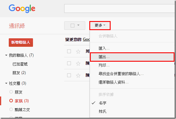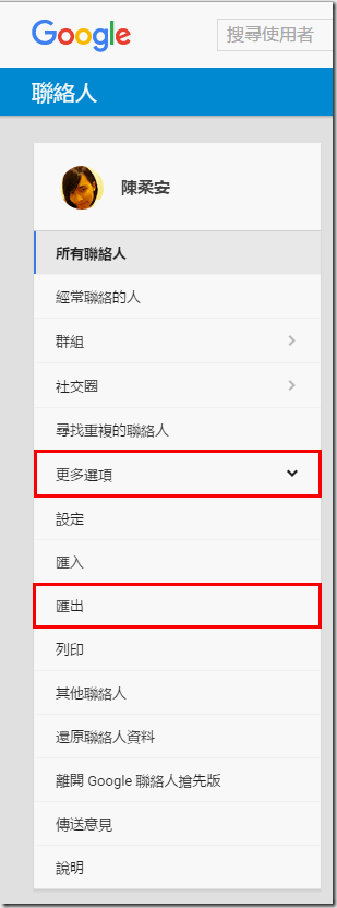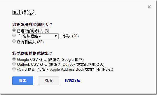 5.如果不是要匯出所有連絡人,或是匯出群組的連絡人,就要回到上一步驟先選取聯絡人,才能勾選已選取的聯絡人。而匯出格式選擇Google或Outlook都可以,但根據選擇從OWA中匯入時的選擇也會不同喔~