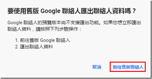 3.由於新版的介面還沒有匯入匯出的功能,因此會跳出視窗,點選前往舊版聯絡人。