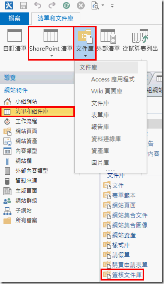 3.在左方導覽中點選清單組件庫,點選上方SharePoint清單或文件庫新增應用程式,或直接點兩下現有應用程式的名稱。