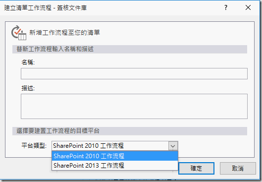 5.在新增時平台類型要選擇SharePoint2010工作流程,不然無法直接使用核准流程的選項。