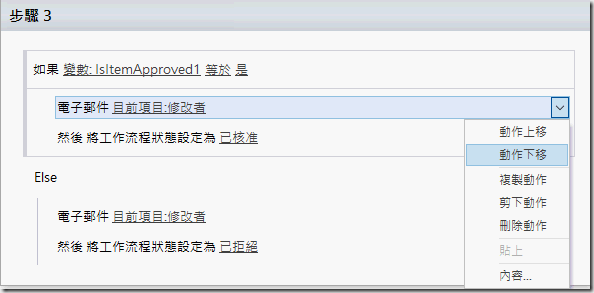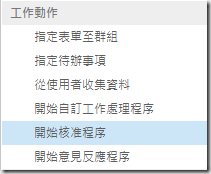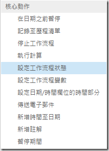 7.在本篇文章的範例,在動作中,我使用到設定工作流程狀態、傳送電子郵件和開始核准程序。