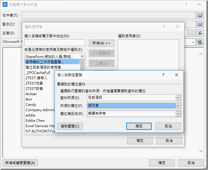 插入動作傳送電子郵件,選擇使用者的工作流程查閱...,來源的欄位選擇修改者。