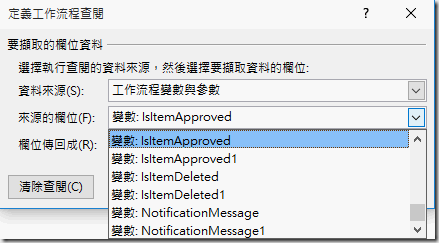 插入條件若任何值等於值,點選任何值,在資料來源選擇工作流程變數與參數,來源的欄位選擇變數:IsItemApproved。