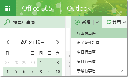 2.進入行事曆後,在畫面靠近左上角的地方選擇新增>行事曆事件。