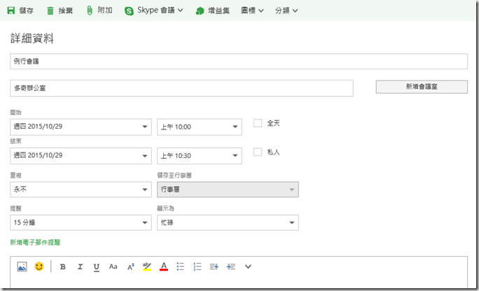 3.進入編輯事件的視窗,在左方可以填寫標題、地點、內容,還可以設定時間、是否為例行性、多久前提醒、會議中欲顯示的狀態。