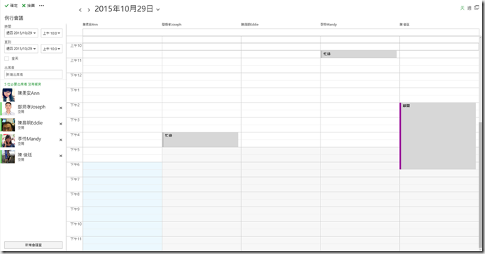 在排程助理員中可以看到出席者行事曆中的狀態,方便我們安排適合的會議時間。