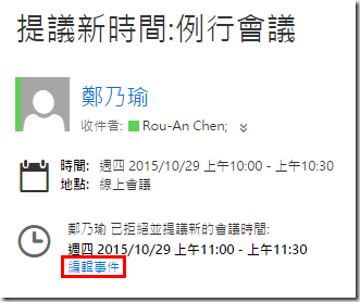 4.召集人會收到通知的郵件,可以選擇編輯事件來改變會議時間。