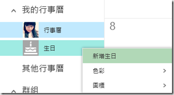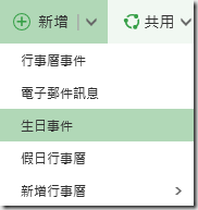 新增追蹤生日用的行事曆,生日行事曆無法新增一般的事件,只能用新增生日事件,請點選左上角新增>生日事件,或是對著生日行事曆點選右鍵>新增生日。