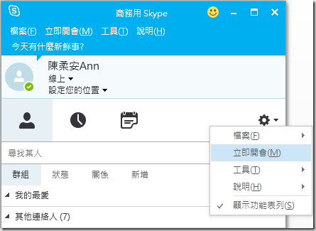 1.首先登入Skype For Business後,在右上角齒輪圖案的右邊下拉式選單中選擇”立即開會”。