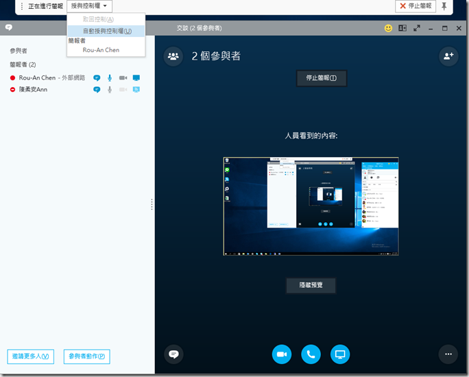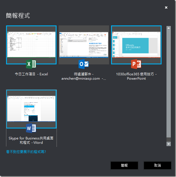 使用展示程式,可以同時選擇多個程式,展示時不需要在Skype for Business中切換,參與者不會看到除了被選程式以外的畫面,和展示桌面一樣可以授予他人控制權。