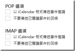 該頁面提供Office365的POP和IMAP伺服器資訊,如果有需要以其他電子郵件程式收發email可以參照這些資訊設定。另外還可變更會議邀請和讀信回條的格式,此設定只會影響使用POP和IMAP的電子郵件程式的畫面。