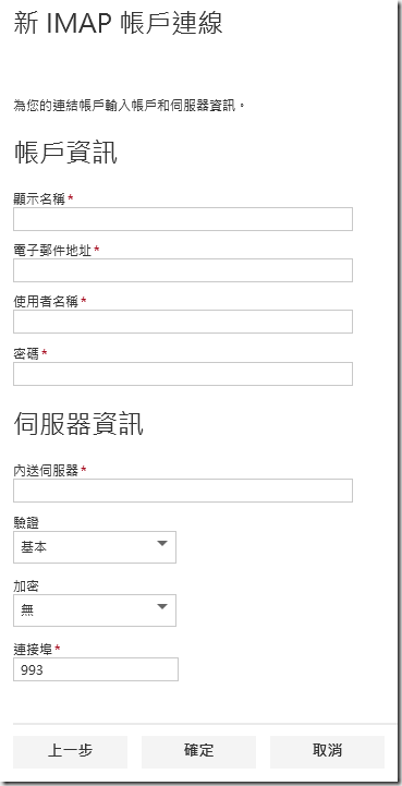 3.如果無法連線成功,可能需要設定IMAP和POP的伺服器資訊。