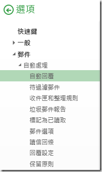 或是選擇選項後,在郵件>自動處理下面找到自動回覆。