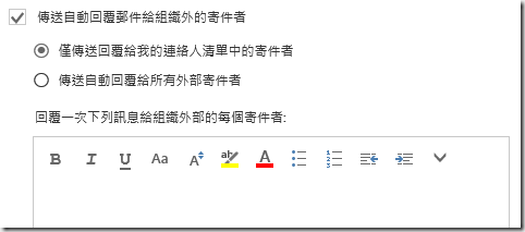 5.勾選是否要自動回覆給外部寄件者,還可以選擇是否要回覆給不在聯絡人清單中的外部寄件者。