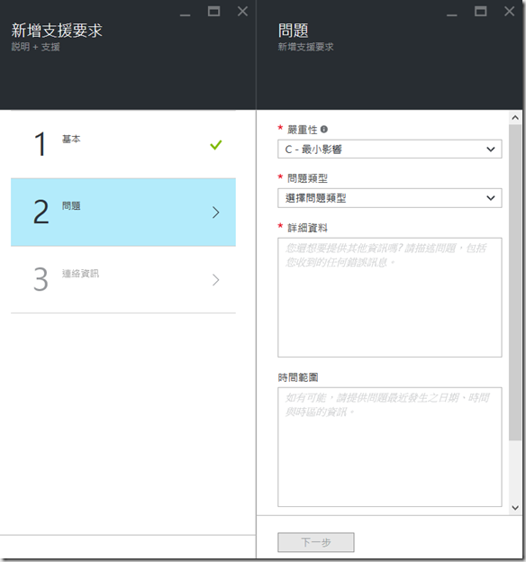 - 點擊後會產生一個「新增支援要求」視窗,畫面上可以看到三個步驟,分別為基本、問題、連絡資訊。