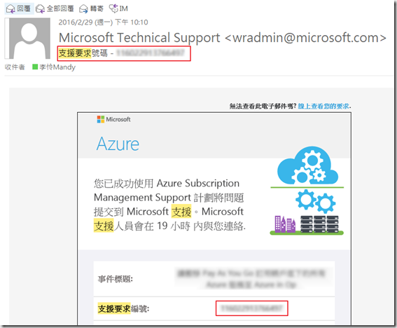 - 建立完成之後,請等待微軟客服主動聯繫 (如果是早上問的問題,基本上,微軟在當天下午就會回覆,最晚隔一天回覆),如果有較急的事情要與工程師連絡,請利用 Azure 客服電話 (0800-008-833#2#9),並報上支援要求編號 (在送出支援要求後,會產生一個支援要求號碼,並寄到電子信箱,如下圖),就可以聯繫到負責的工程師。