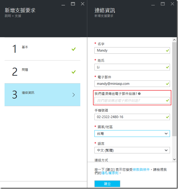 - 在第三個「連絡資訊」步驟,需要填寫建立這個支援要求的連絡人資訊,微軟收到支援要求後,會主動和表格中填寫的連絡人聯繫。除了名字、姓氏、電子信箱、手機號碼、國家/地區、語言外,以下有幾個欄位要補充說明: