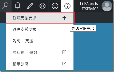 - 登入後,可以從畫面右上角點擊問號圖示,並點擊「新增支援要求」。
