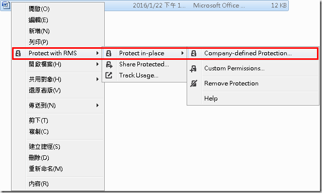 1.安裝完Microsoft RMS後,只要對著檔案點選右鍵,就會多出一個Protect with RMS。可以選擇加密在本機,或是分享檔案前加密。