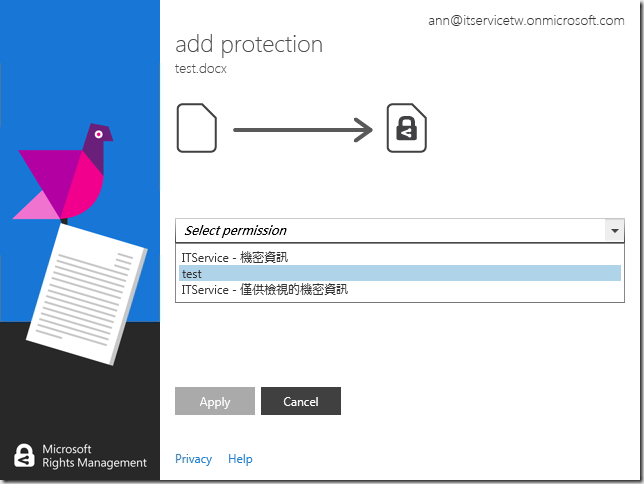 在使用Azure RMS前,我們可以自訂權限原則範本,提供給使用者使用。