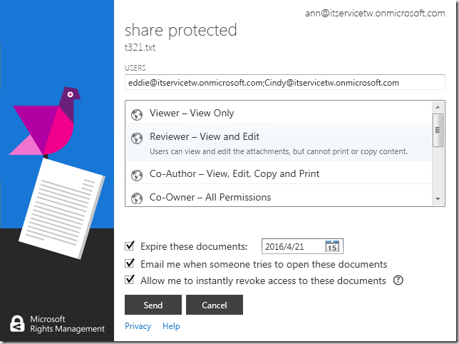 5.而如果選擇分享檔案前加密,則是要輸入欲分享對象的Email,然後選擇誰可以使用此檔案。最後可以設定分享檔案的到期日,當有人嘗試開啟此檔案時是否要Email通知,是否允許使用者立即撤銷存取權。