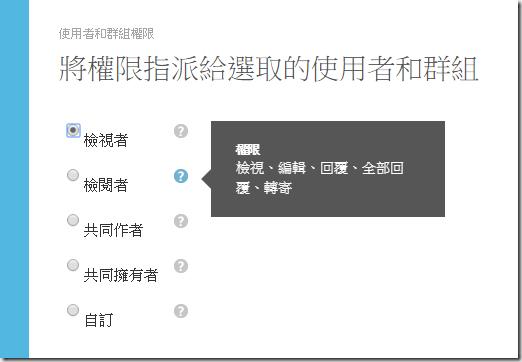 2.而使用者可自訂的權限如下圖,分為擁有者(完整權限)、共同作者(檢視、編輯、複製、列印、回覆、全部回覆、轉寄)、檢閱(檢視、編輯、回覆、全部回覆、轉寄)、檢視(只能檢視)。