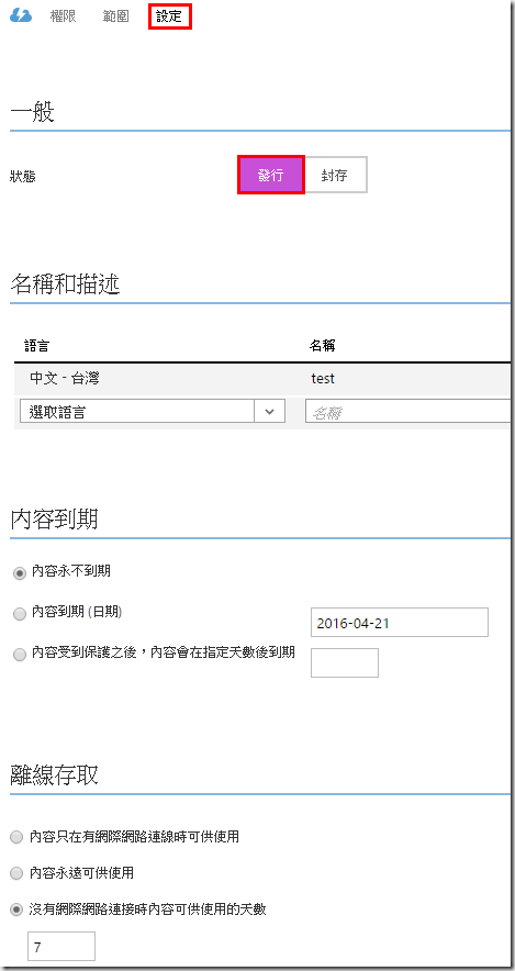 9.最後點選設定,選擇是否要發行此範本,另外也可以增加語言顯示,分享檔案的時間是否為永久,或是否允許離線存取也都是在這裡設定。