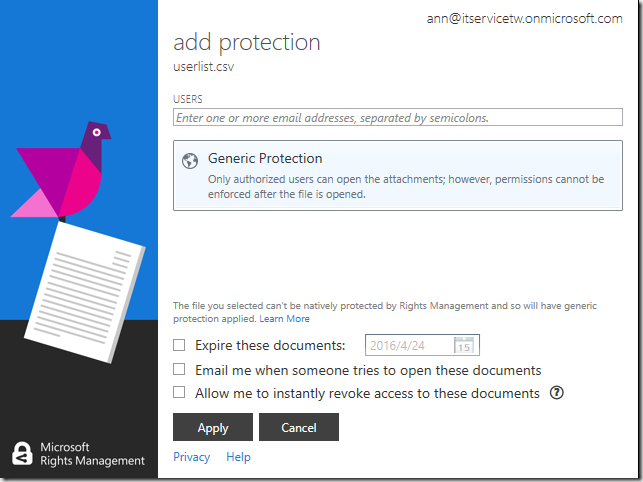 1.只有特定的檔案在使用自訂權限和分享檔案前加密時,可以有自訂的選擇,不然就會如下圖,只能選擇Generic Protection,雖然只有指定的使用者可開啟附件檔,但在檔案被開啟後就無法保證其強制性了。即使使用範本加密,也是一樣的狀況。目前確定可完整使用加密功能的特定檔案有Office檔(例如docx、xlsx等)、jpg、png、txt、pdf等,可參考官方文件的說明https://technet.microsoft.com/en-us/library/dn339003(v=ws.10).aspx。