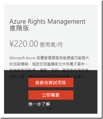 8.找到Azure Rights Management進階版,可啟動免費試用版,之後再照Office365的方式套用授權。可參考[多奇數位] Office 365 部落格中的此篇文章Office 365 管理者日誌 (22) 購買Office365後如何啟動序號並套用授權。