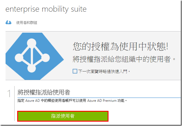 6.選擇顯示所有使用者,點選欲套用授權的使用者,點選下方的指派。若是需要大量套用的話則要建立群組後,指派給群組。