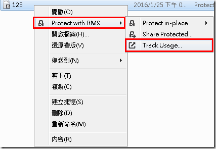 1.對檔案點選右鍵>Protect with RMS>Track Usage。